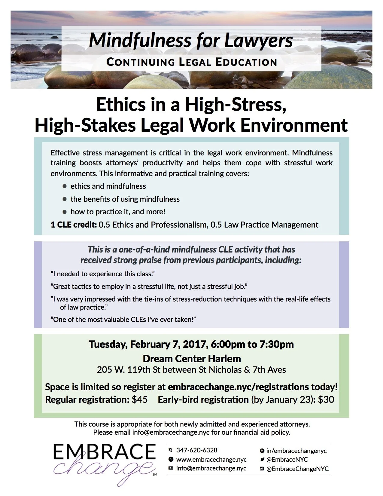 Join me for a special CLE on Tuesday, February 7 in Harlem! It's an ethics and mindfulness training, and for the first time, I'll be adding a bonus group discussion afterwards about being a woman in the legal world.